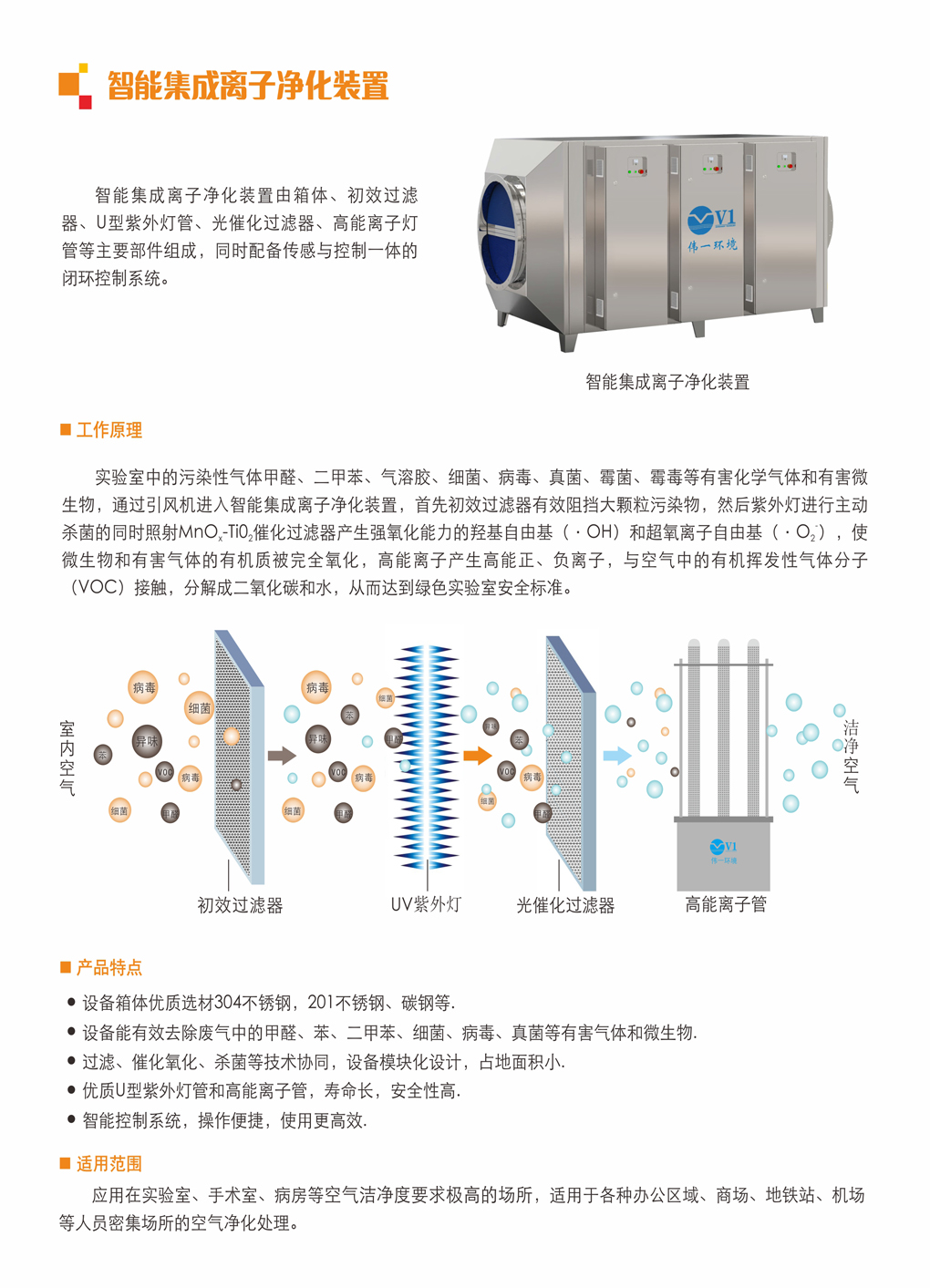 菜单产品中心Product center 空气消毒机 壁挂式空气消毒机 柜式空气消毒机 嵌入式空气消毒机 吸顶式空气消毒机 移动式空气消毒机 中央空调净化装置 风柜式空气净化装置 管道式空气净化装置 光氢离子空气净化装置 回风口式空气净化装置 废气处理设备 不锈钢喷淋塔 干式化学净化箱 活性炭吸附箱 静电式油烟净化器 一体光氧废气处理机 一体扰流喷淋除臭设备 空气过滤器 FFU过滤器 初效过滤器 高效过滤器 中效过滤器 全国服务热线 13724415008 您的位置:首页 →产品展示 > 废气处理设备 > 一体光氧废气处理机 < > 智能集成离子净化装置关键词:智能集成离子净化装置,智能集成离子净化设备,智能集成离子净化厂家 简介: 1.设备箱体优质选材304不锈钢,201不锈钢、碳钢等2. 设备能有效去除废气中的甲醛、苯、二甲苯、细菌、病毒、真菌等有害气体和微生物.3.无二次污染:光解直接分解甲醛,避免残留释放。4.过滤、催化氧化、杀菌等技术协同,设备模块化设计,占地面积小.5.优质U型紫外灯管和高能离子管,寿命长,安全性高6.智能控制系统,操作便捷,使用更高效7.广谱适用:家居、工业、医疗多场景通用。 产品说明 相关产品 干式化学过滤箱 活性炭环保吸附箱 不锈钢喷淋除雾塔 不锈钢洗涤塔 干式化学过滤器 不锈钢喷淋塔